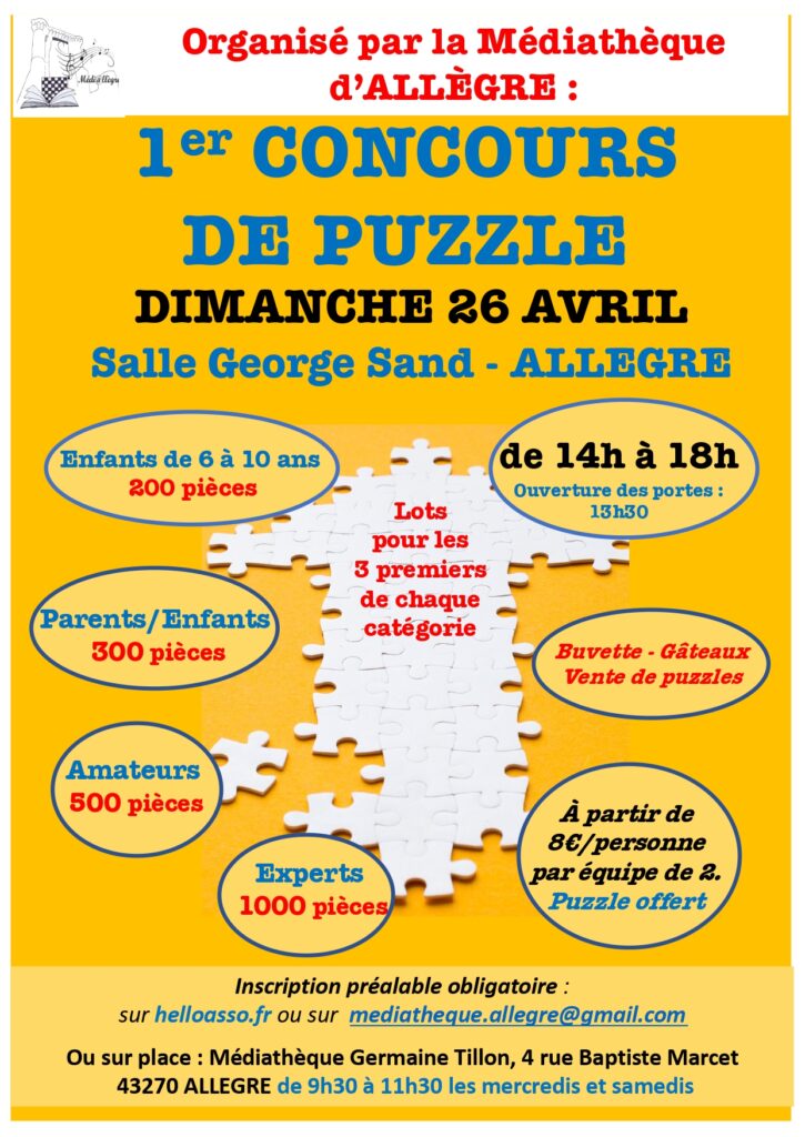 Pour confirmer l’organisation du concours du 26 avril, nous devons commander les puzzles avant le 31 mars. Merci de vous inscrire — ou d’inscrire les personnes intéressées — avant cette date. Sans au moins 25 binômes, l’événement devra être annulé.
